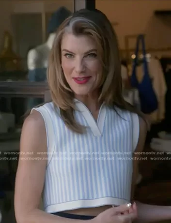 (played by ) on 9-1-1 on Fox was spotted wearing this white and blue striped cropped top on 9-1-1 on episode 'Ghost of a Second Chance' (7x07) in May 2024. 's Sweater is the Aussy Sleeveless Cropped Sweater by Sandro.