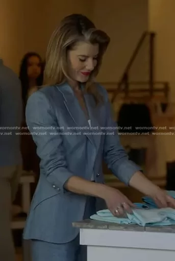 (played by ) on 9-1-1 on ABC was spotted wearing this blue striped blazer and pants on 9-1-1 on episode 'Ghost of a Second Chance' (7x07) in May 2024. 's Jacket is the Chamberlain Stripe Cotton Blend Blazer by L'Agence . 's Pants is the Livvy Pinstripe Straight Leg Trousers by L'Agence.