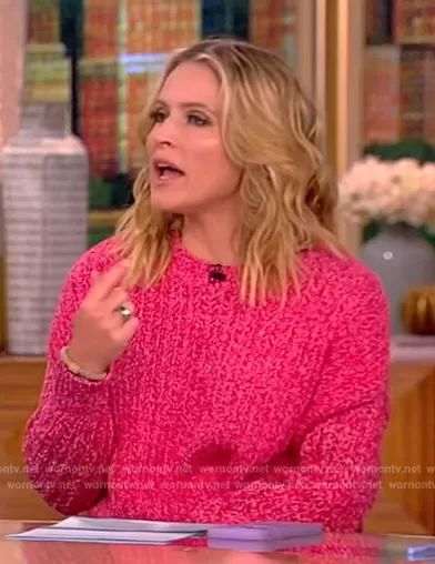 Sara Haines on The View on ABC was spotted wearing this pink sweater and printed skirt on The View on May 10 2024's episode. Sara's Sweater is the Edie Cotton-Blend Open-Knit Relaxed Sweater by Rag and Bone . Sara's Skirt is the Acadian Tie Dye Silk Maxi Skirt by Zimmermann.