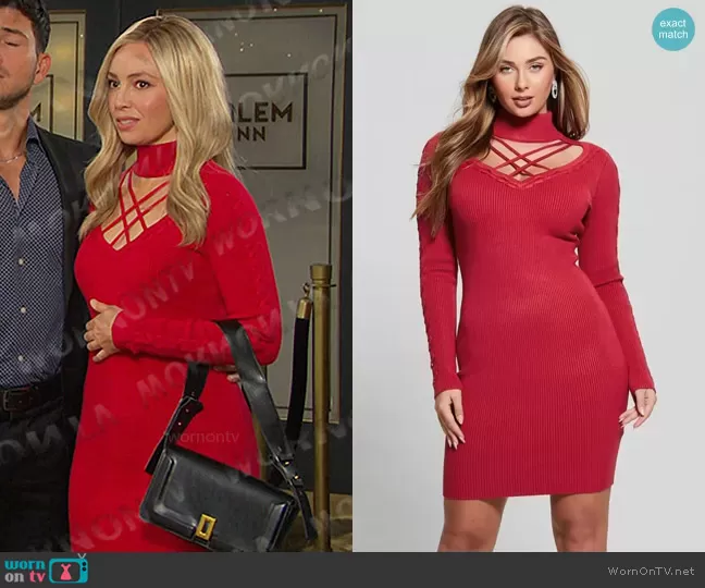 Theresa Donovan (played by Emily O'Brien) on Days of our Lives on Peacock was spotted wearing this red strappy criss-cross knit dress on Days of our Lives on May 11 2024's episode. Theresa's Dress is the Eco Dylan Mock Neck Cutout Dress by Guess . Theresa's Bag is the Sidney Trophy Shoulder Bag in black by Topshop.