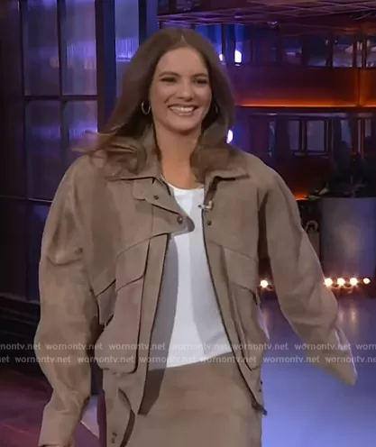on The Kelly Clarkson Show on NBC was spotted wearing this brown suede jacket on The Kelly Clarkson Show on May 10 2024's episode. 's Jacket is the Suede biker jacket by Magda Mutrym . 's Skirt is the Suede mini skirt by Magda Mutrym.