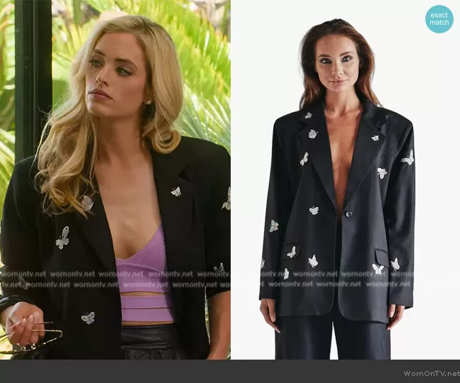 Alexandra Jarvis (played by Alexandra Jarvis) on Selling the OC on Netflix was spotted wearing this black butterfly embellished blazer on Selling the OC on episode 'Offer Not Accepted' (3x03) in May 2024. Alexandra's Blazer is the The Butterfly Blazer by Romani.