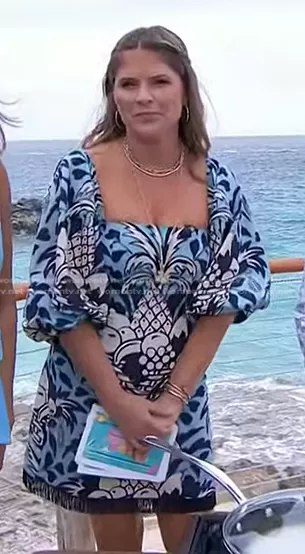 Jenna Bush Hager on Today on NBC was spotted wearing this blue fruit print puff sleeve dress on Today on May 10 2024's episode. Jenna's Dress is the Montauk Dress in Blue Fruit Basket by Cara Cara.