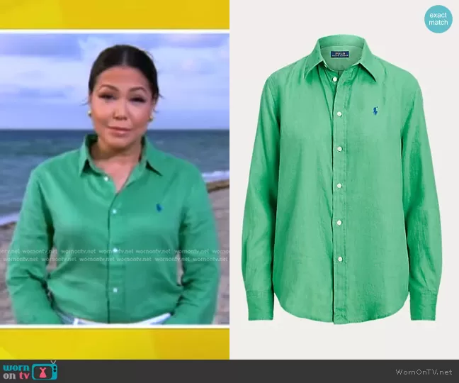 Stephanie Ramos on Good Morning America on ABC was spotted wearing this green button down shirt on Good Morning America on May 10 2024's episode. Stephanie's Top is the Linen Long Sleeve Shirt in Vineyard Green by Polo Ralph Lauren.