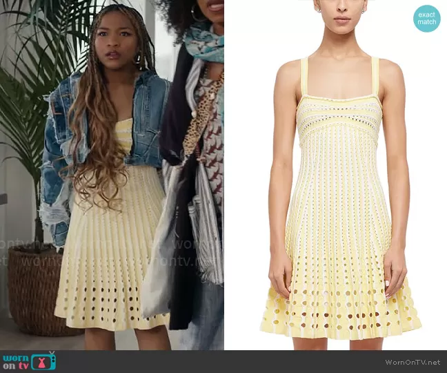 Delilah (played by Laya DeLeon Hayes) on The Equalizer on CBS was spotted wearing this yellow striped dress and denim jacket on The Equalizer on episode 'The Big Take' (4x09) in May 2024. Delilah's Dress is the Franklin Mini Dress in Sulfur by Simkhai . Delilah's Shoes is the Goldenglow Slingback Sandal in Mangosteen by UGG.