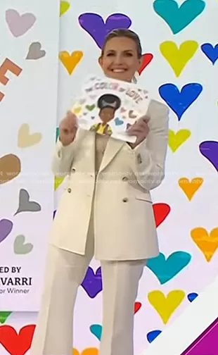 on Today on NBC was spotted wearing this white double breasted blazer and pants on Today on May 13 2024's episode. 's Jacket is the Angela Blazer in Ivory Wool by Gabriela Hearst . 's Pants is the Vesta Pant in Ivory Wool by Gabriela Hearst . 's Book is the The Color of Love Hardcover by Poppy Harlow.