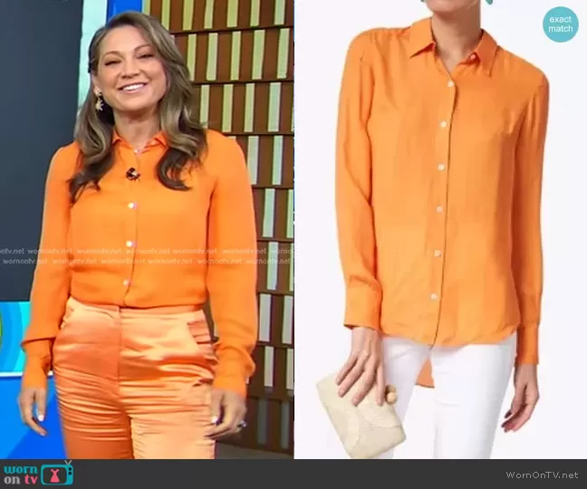 Ginger Zee on Good Morning America on ABC was spotted wearing this orange button down blouse on Good Morning America on May 13 2024's episode. Ginger's Top is the Morgane Silk Blend Shirt by Veronica Beard . Ginger's Earrings is the Celestial Drop Earrings by Baublebar.