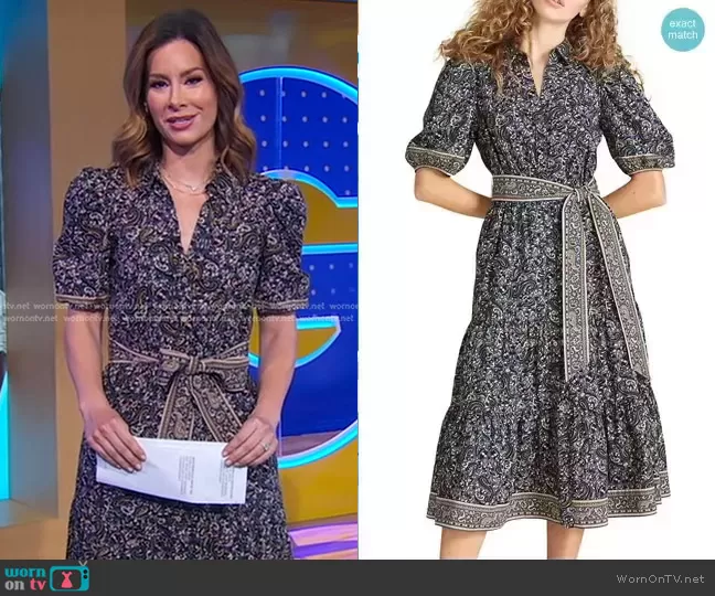 Veronica Beard Eunice Printed Puff-Sleeve Midi Dress worn by Rebecca Jarvis on Good Morning America