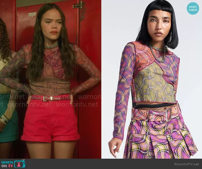 Minnie 'Mouse' Honrada (played by Malia Pyles) on Pretty Little Liars Original Sin on HBO was spotted wearing this mixed print mesh top on Pretty Little Liars Original Sin on episode 'Chapter Twelve: Summer Lovin' (2x02) in May 2024. Mouse's Top is the Bopper Top by Ragged Priest . Mouse's Socks is the Cloudy Crew Sock by Happy Socks . Mouse's Shoes is the Addina Flower Oxfords by Dr Martens.