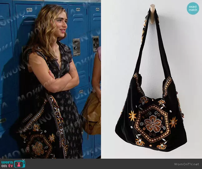 Holly Jonas (played by Ashley Puzemis) on Days of our Lives on Peacock was spotted wearing this black floral dress and embroidered bag on Days of our Lives on May 14 2024's episode. Holly's Dress is the Joaquin Floral Ruffle Plunge Dress in D Ruffles Black by Free People . Holly's Bag is the Vic Velvet Slouchy Bag in Moody Midnight by Free People.