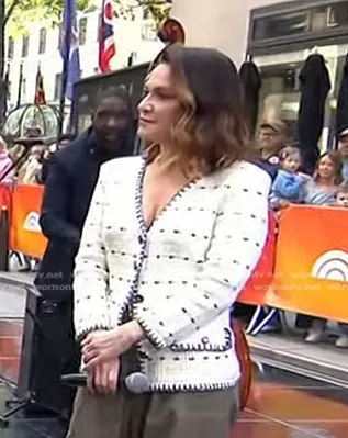 on Today on NBC was spotted wearing this white sequin cardigan jacket on Today on May 14 2024's episode. 's Jacket is the Ceriani Sequin Sweater Jacket by Veronica Beard.