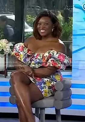 on Today on NBC was spotted wearing this floral off-shoulder dress on Today on May 14 2024's episode. 's Dress is the Major Drama Dress in Charm Peony White Taffeta by Show Me Your Mumu.