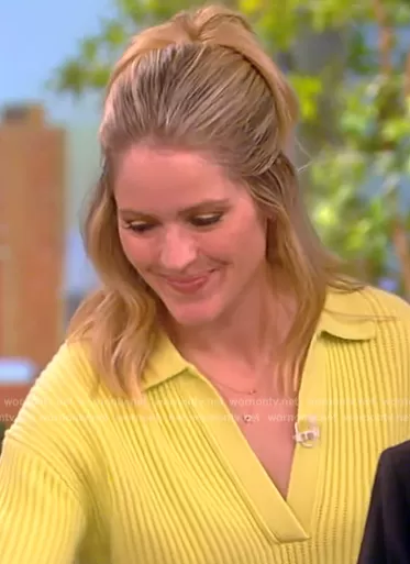Sara Haines on The View on ABC was spotted wearing this yellow ribbed polo on The View on May 14 2024's episode. Sara's Top is the Tallulah Cashmere Short-Sleeve Polo Sweater by TWP.