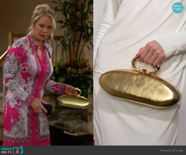 Brooke Logan (played by Katherine Kelly Lang) on The Bold and the Beautiful on CBS was spotted wearing this pink baroque print shirtdress on The Bold and the Beautiful on May 14 2024's episode. Brooke's Dress is the Cutout Baroque Midi Shirtdress by Versace . Brooke's Necklace is the Pavé Chain Link Necklace by Baublebar . Brooke's Bag is the Molten Gold Bullet Minaudière by Alexis Bittar . Brooke's Shoes is the Raquel Viline 105mm Pumps by Alexandre Vauthier.