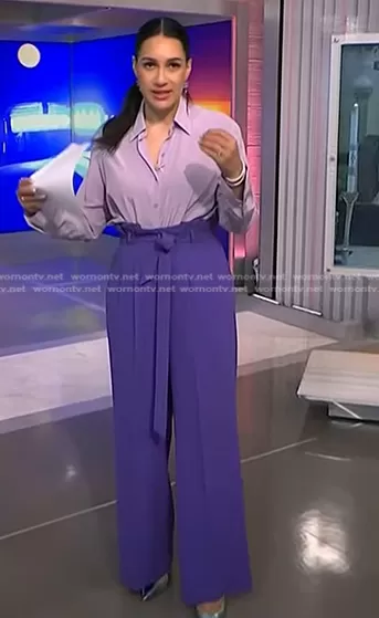 Morgan Radford on NBC News Daily on NBC was spotted wearing this purple paperbag waist pants on NBC News Daily on Aug 06 2024's episode. Morgan's Pants is the Farrel Pants by Alice + Olivia.