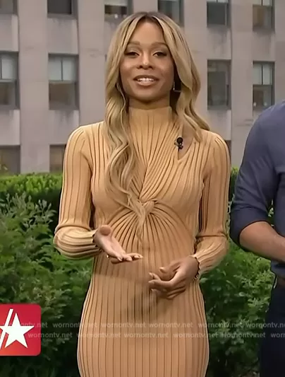 Zuri Hall on Access Hollywood on NBC was spotted wearing this beige ribbed twist front dress on Access Hollywood on May 14 2024's episode. Zuri's Dress is the Collins Rib Twist Midi Dress by Acler.