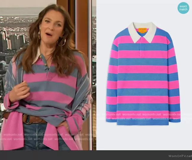 Drew Barrymore on The Drew Barrymore Show on CBS was spotted wearing this blue stripe jersey top on The Drew Barrymore Show on May 13 2024's episode. Drew's Top is the Striped Rugby Top by Guest in Residence . Drew's Sweater is the Baja Everywear Cardigan by Guest in Residence.