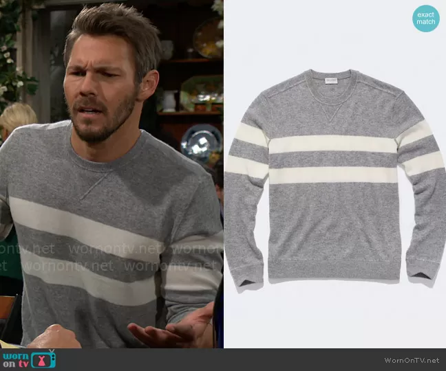 Liam Spencer (played by Scott Clifton) on The Bold and the Beautiful on CBS was spotted wearing this grey double stripe sweater on The Bold and the Beautiful on May 15 2024's episode. Liam's Sweater is the Cashmere Stripe Sweatshirt in Heather Grey by Todd Snyder.