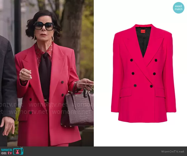 Margaret Wright (played by Marcia Gay Harden) on So Help Me Todd on CBS was spotted wearing this pink suit on So Help Me Todd on episode 'The Tooth Is Out There' (2x10) in May 2024. Margaret's Jacket is the Double-breasted tailored blazer by Hugo . Margaret's Pants is the Wide-leg tailored trousers by Hugo . Margaret's Belt is the New Gancini Reversible Leather Belt by Ferragamo . Margaret's Bag is the The Strathberry Midi Tote in Croc-Embossed Leather Burgundy by Strathberry . Margaret's Sunglasses is the Square Web Arms Sunglasses by Gucci.