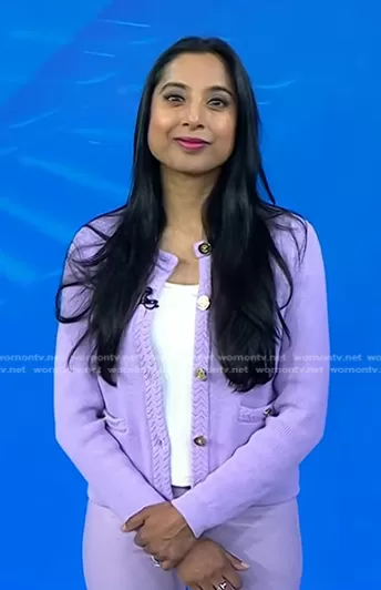 on Today on NBC was spotted wearing this lilac braided trim cardigan on Today on May 16 2024's episode. 's Sweater is the Cotton Lady Jacket Cardigan Sweater in Dried Lavender by J. Crew.