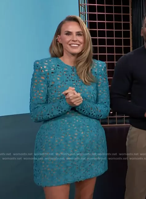 Keltie Knight on E! News on E! was spotted wearing this blue floral crochet knit mini dress on E! News on May 16 2024's episode. Keltie's Dress is the Casey Long-Sleeve Minidress by Bronx and Banco.
