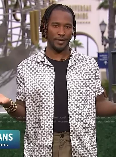 Scott Evans on Access Hollywood on NBC was spotted wearing this gray printed short sleeve shirt on Access Hollywood on May 16 2024's episode. Scott's Shirt is the Pedro Printed Shirt by Reiss.