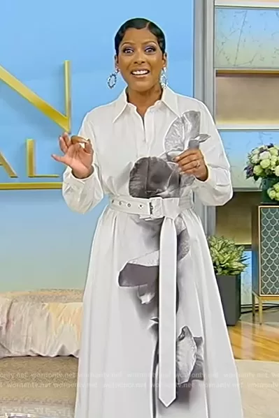 Tamron Hall on Tamron Hall Show on ABC was spotted wearing this white floral print shirtdress on Tamron Hall Show on May 17 2024's episode. Tamron's Dress is the Orchid-Print Poplin Belted Midi Shirtdress by Alexander McQueen.
