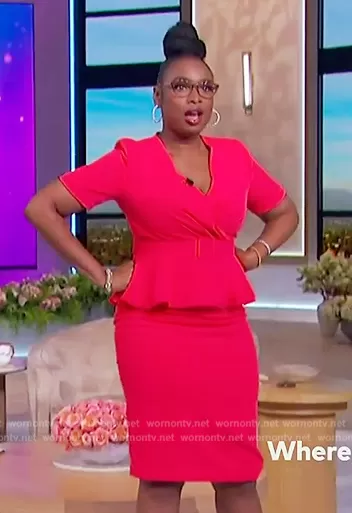 Jennifer Hudson on The Jennifer Hudson Show on FOX was spotted wearing this red belted peplum dress on The Jennifer Hudson Show on May 17 2024's episode. Jennifer's Dress is the Belted Short-Sleeve Peplum Dress by Badgley Mischka.