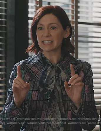 (played by ) on Elsbeth on CBS was spotted wearing this geometric print jacket on on Elsbeth on episode 'Reality Shock' (1x03) in May 2024. 's Blazer is the Geometric Patchwork Motif Jacket by Emporio Armani.
