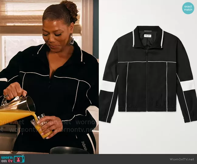 Robyn McCall (played by Queen Latifah) on The Equalizer on CBS was spotted wearing this tracksuit on The Equalizer on episode 'Shattered' (4x10) in May 2024. Robyn's Jacket is the Teddy Logo-Appliquéd Satin Jacket by Saint Laurent . Robyn's Pants is the Straight-Leg Satin-Jersey Sweatpants by Saint Laurent . Robyn's Earrings is the Silvertone Chain Hoop Earrings by Alexander McQueen.