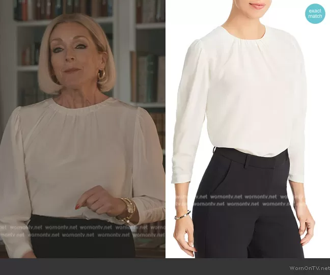 (played by Jane Krakowski) on Elsbeth on CBS was spotted wearing this beige coat and white top on Elsbeth on episode 'A Classic New York Character' (1x02) in Apr 2024. 's Top is the Bagana Silk Top by Boss . 's Coat is the Manuela Icon belted camel hair coat by Max Mara.