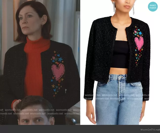 Elsbeth Tascioni (played by Carrie Preston) on Elsbeth on CBS was spotted wearing this black heart embroidered jacket on Elsbeth on episode 'A Classic New York Character' (1x02) in Apr 2024. Elsbeth's Jacket is the Heart Patch Boucle Jacket by AQUA x Kerri Rosenthal.