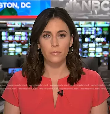 on Today on NBC was spotted wearing this red v-neck dress on Today on May 20 2024's episode. 's Dress is the Short Sleeve Dart Fit & Flare Dress in Tomato by Elie Tahari.