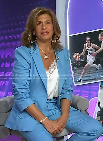 Hoda Kotb on Today on NBC was spotted wearing this blue ruched sleeve blazer and pant suit on Today on Aug 13 2024's episode. Hoda's Jacket is the Louisa Ruched Sleeve Blazer in Blissful Blue by Cinq a Sept . Hoda's Pants is the Shailene Flare Pants in Blissful Blue by Cinq a Sept.