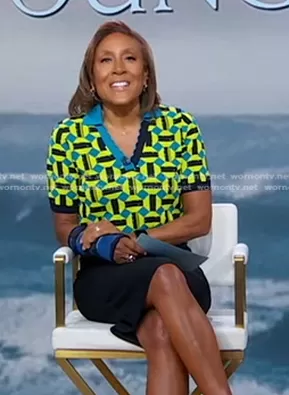 Robin Roberts on Good Morning America on ABC was spotted wearing this yellow geometric knit polo top on Good Morning America on May 20 2024's episode. Robin's Top is the Hannah Knit Jacquard Top in Huge Square Dot by Diane von Furstenberg.
