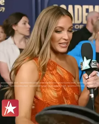 Emily Orozco on Access Hollywood on NBC was spotted wearing this orange beaded mini dress on Access Hollywood on May 20 2024's episode. Emily's Dress is the Wayla One Shoulder Mini Dress by Bronx and Banco.