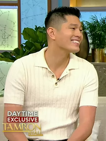 on Tamron Hall Show on ABC was spotted wearing this white ribbed polo on Tamron Hall Show on May 21 2024's episode. 's Shirt is the Muscle fit knit textured rib polo shirt in stone by ASOS.