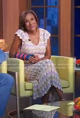 Robin Roberts on Good Morning America on ABC was spotted wearing this scalloped crochet midi dress on Good Morning America on May 21 2024's episode. Robin's Dress is the Crochet Knit Dress by Derek Lam Collective.
