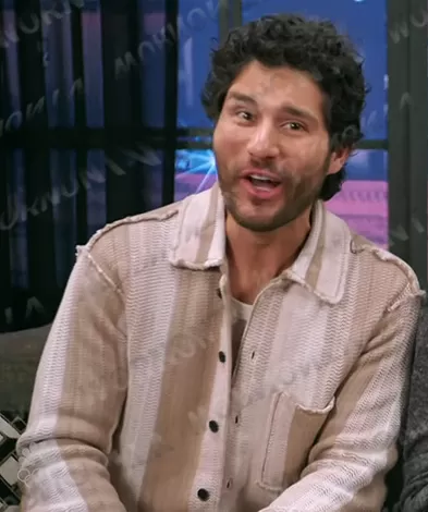 on The Voice on NBC was spotted wearing this Dan Smyers’ beige striped knit shirt on The Voice on May 21 2024's episode. 's Sweater is the Truck Stripe Cotton Cardigan in Dust Taupe by All Saints.