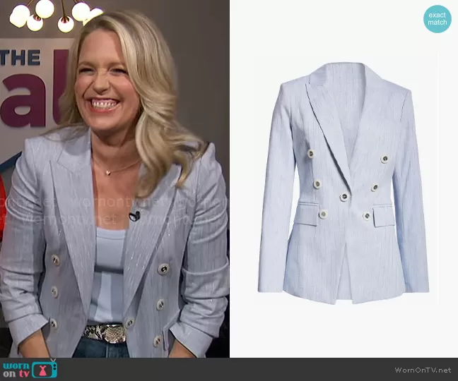 on The Talk on CBS was spotted wearing this blue blazer on The Talk on May 22 2024's episode. 's Jacket is the Gaya Metallic Stripe Jacket in Blue Oasis by Veronica Beard.