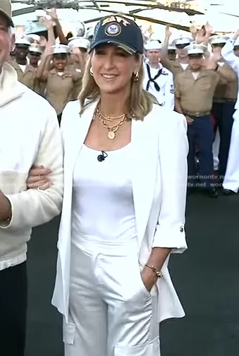 Lara Spencer on Good Morning America on ABC was spotted wearing this white roll-up sleeve jacket and satin cargo pants on Good Morning America on May 22 2024's episode. Lara's Jacket is the Blazer with Rolled-Up Sleeves in Oyster-white by Zara . Lara's Pants is the Ruched Satin Effect Cargo Pants by Zara.