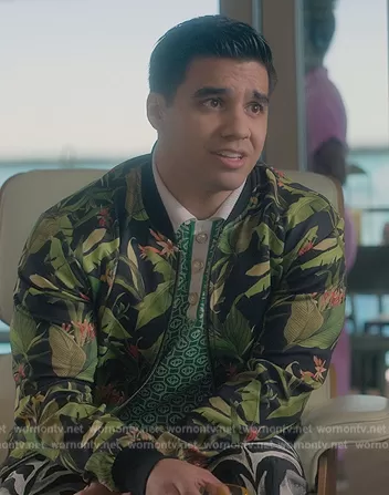 Vivek Shah (played by Jordan Buhat) on Grown-ish on Freeform was spotted wearing this floral bomber jacket on Grown-ish on episode 'Grown' (6x18) in May 2024. Vivek's Shirt is the Monogram Jacquard Short-Sleeved Polo Shirt by Casablanca . Vivek's Jacket is the Faux Leather Floral Bomber Jacket by Zara.