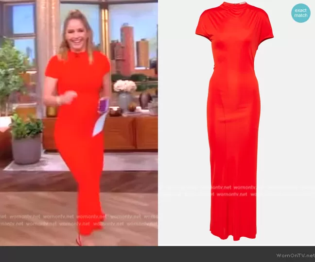 Sara Haines on The View on ABC was spotted wearing this red short sleeve dress on The View on May 23 2024's episode. Sara's Dress is the Yenza Dress by Khaite.