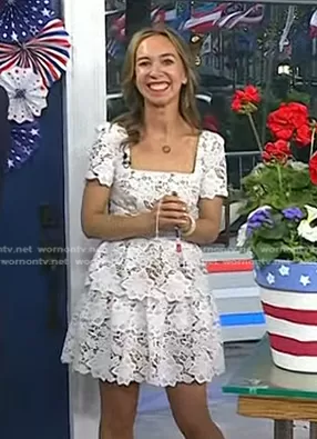on Today on NBC was spotted wearing this white floral lace mini dress on Today on May 23 2024's episode. 's Dress is the Belted Guipure Lace Minidress by Self Portrait . 's Shoes is the Nudistia Espadrille Wedge Sandals in Light Gold by Stuart Weitzman.