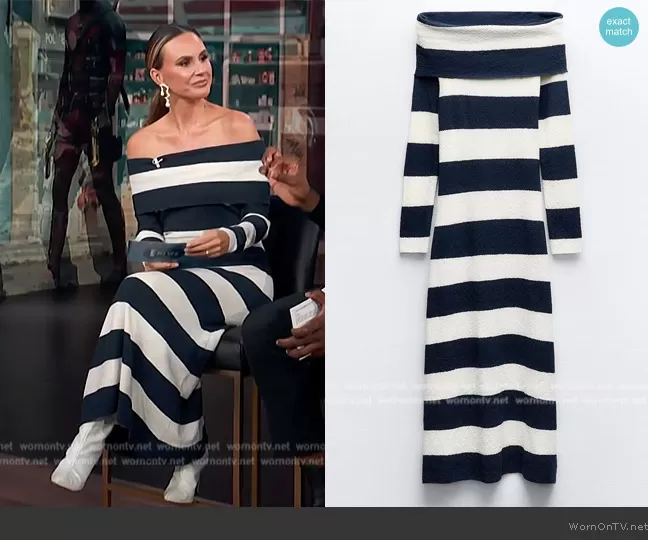 Keltie Knight on E! News on E! was spotted wearing this striped dress on E! News on Jun 03 2024's episode. Keltie's Dress is the Off The Shoulder Knit Dress by Zara.