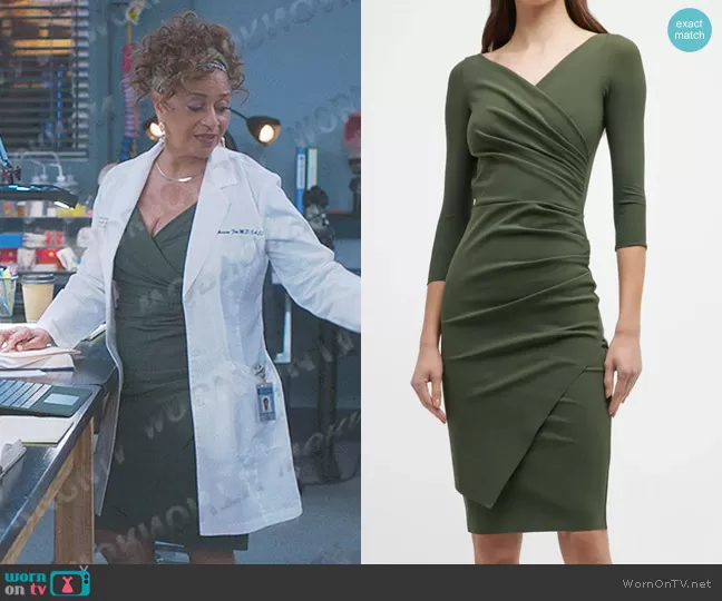 Catherine Avery (played by Debbie Allen) on Greys Anatomy on ABC was spotted wearing this green gathered wrap dress on Greys Anatomy on episode 'I Carry Your Heart' (20x09) in May 2024. Catherine's Dress is the Calantine 3/4-Sleeve Ruched Bodycon Dress by Chiara Boni La Petite Robe . Catherine's Earrings is the Sassy Studs by 8 Other Reasons.