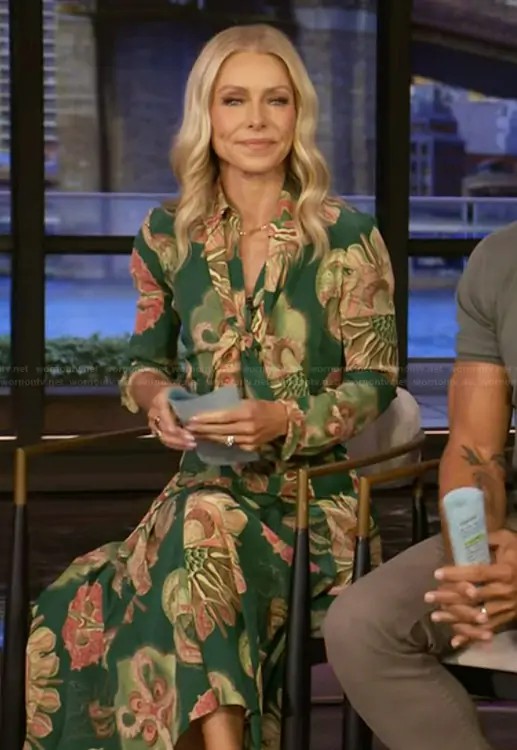 Kelly Ripa on Live with Kelly and Mark on Disney ABC Home Entertainment was spotted wearing this green floral print dress on Live with Kelly and Mark on Sep 22 2025's episode. Kelly's Dress is the Pleated printed silk crepe de chine midi dress by Gucci.