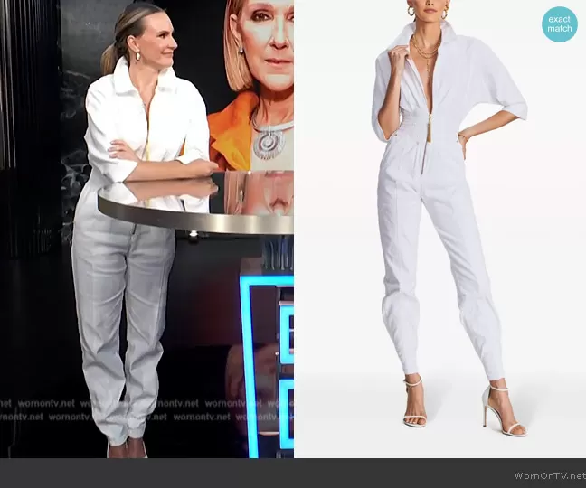Keltie Knight on E! News on E! was spotted wearing this white denim jumpsuit on E! News on May 24 2024's episode. Keltie's Jumpsuit is the Ellis Jumpsuit by Retrofete.