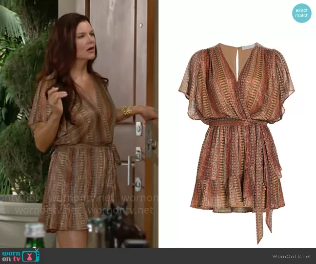 Katie Logan (played by Heather Tom) on The Bold and the Beautiful on CBS was spotted wearing this metallic printed dress on The Bold and the Beautiful on May 27 2024's episode. Katie's Dress is the Chelsea Belted Printed Minidress by Ramy Brook .