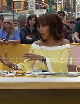 on The Drew Barrymore Show on CBS was spotted wearing this yellow off-shoulder bell sleeve top on The Drew Barrymore Show on May 27 2024's episode. 's Sweater is the Colorblock Flare Sleeve Sweater in Yellow/White by Boston Proper.